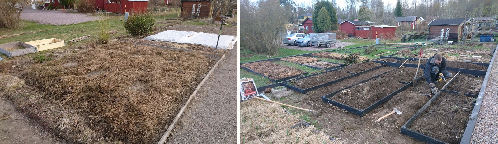 I helgen påbörjade vi med att bygga odlingsbäddarna på den ”övre delen” av odlingslotten. Att gräva i jorden i år i jämförelse med förra året är som natt och dag! Jorden på kolonistugan är kompakt lera. Stenhårt och as tungt att gräva i. Men efter bara en enda säsong med ganska spartansk täckodling (pga brist på täckmaterial) så har jorden blivit så mycket bättre. Alla bör verkligen täckodla! Jorden uppskattar det verkligen. Och har man problem med mördarsniglar så finns det sätt att komma runt det, t.ex. som att sätta upp en snigelkant runt hela odlingen. Vår odlingslott ligger nämligen precis bredvid den stora allmänna komposten och här ska det tidigare varit värsta motorvägen för sniglarna. Vi hittade hela tre stycken mördarsniglar innanför kanten på hela sommaren och de kan lika gärna ha varit där innan vi satte upp kanten. Jag hoppas på lika gott resultat i år.