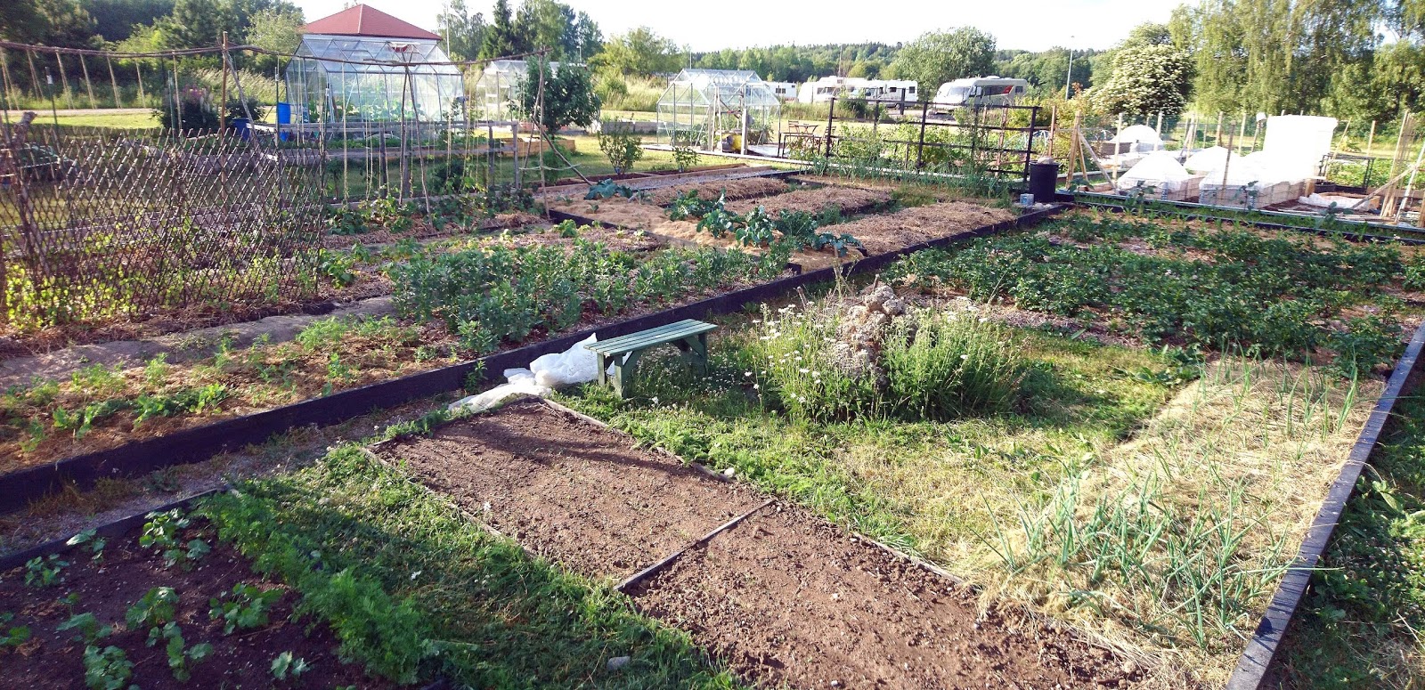 - Anlagt fyra bäddar direkt på gräsmattan (först kartong, sen en salig blandning av hästgödsel, jord, löv, ensilage, gammal halm, träflis och gräsklipp). En för kål, en för allåkerbär, en för bönor och en för pumpa och squash.