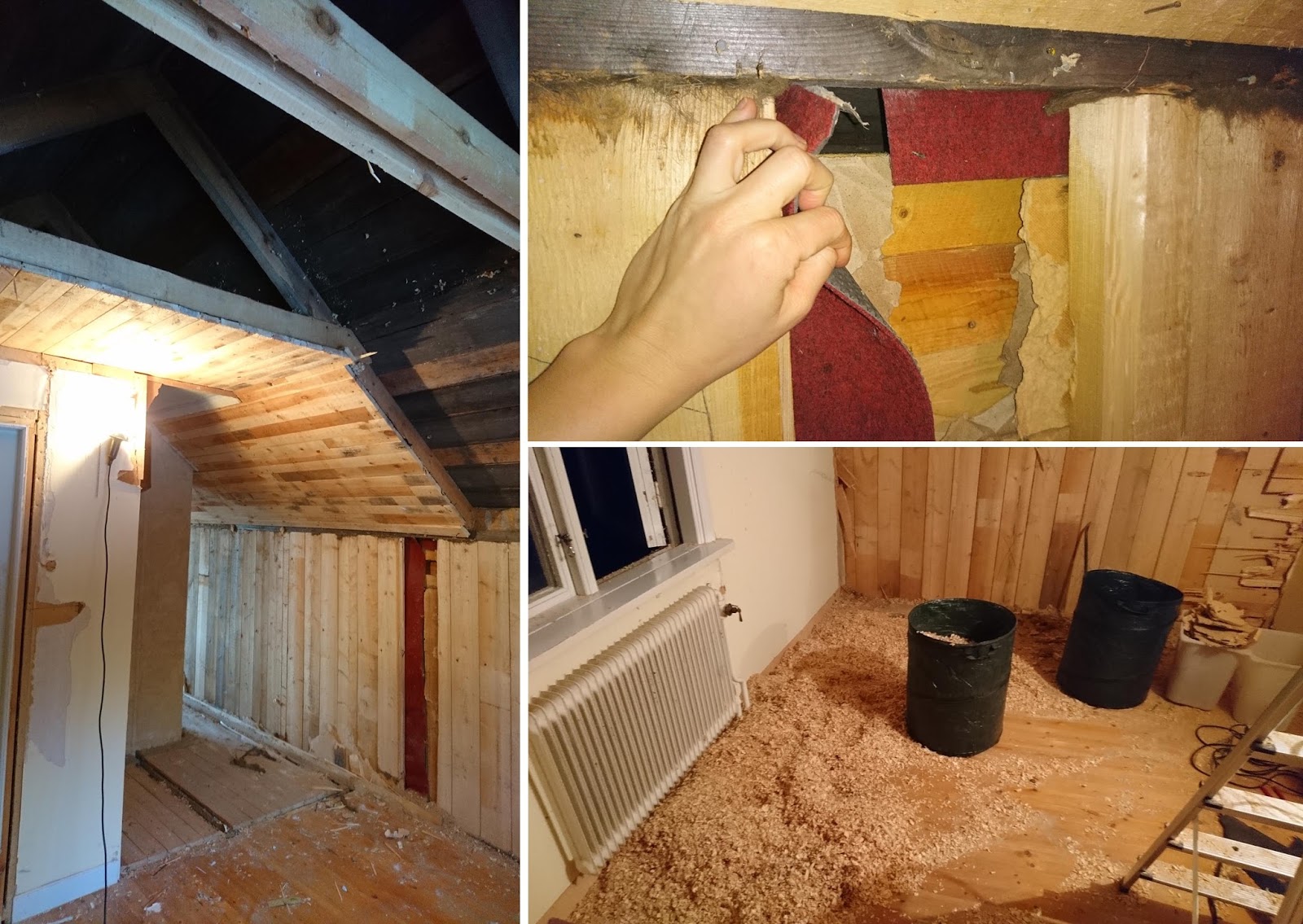 De första tre lagerna att är nu i alla fall borta från alla väggar i båda rummen, lika så de inbyggnad garderoberna. Taket borta i det blivande sovrummet och tusentals liter sågspån har dumpats bakom ladugården där det ska bli en odlingsbädd så småningom. Det stora klädskåpet står kvar i kontoret och hånar oss. Men i helgen ska den ut genom fönstret. Frågan är bara om den (och fönstret nedanför) kommer vara hel när vi är klara. Utöver att försöka få ut klädskåpet är planen att kommer resten av taket ska rivas och därefter ska hela taket isoleras. Det vore as coolt om vi kunde lämna delar av takstolarna synliga. Men det är tydligen lite osäkert om det blir bra byggnadstekniskt. Jag håller tummarna!