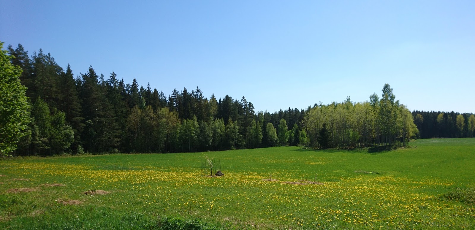 | Vår äng består för tillfället mest av gräs och maskrosor. Men om några år förväntar jag mig värst blomsterprakten här med blåklint, vallmo, blåklockor, prästkragar med mera. |