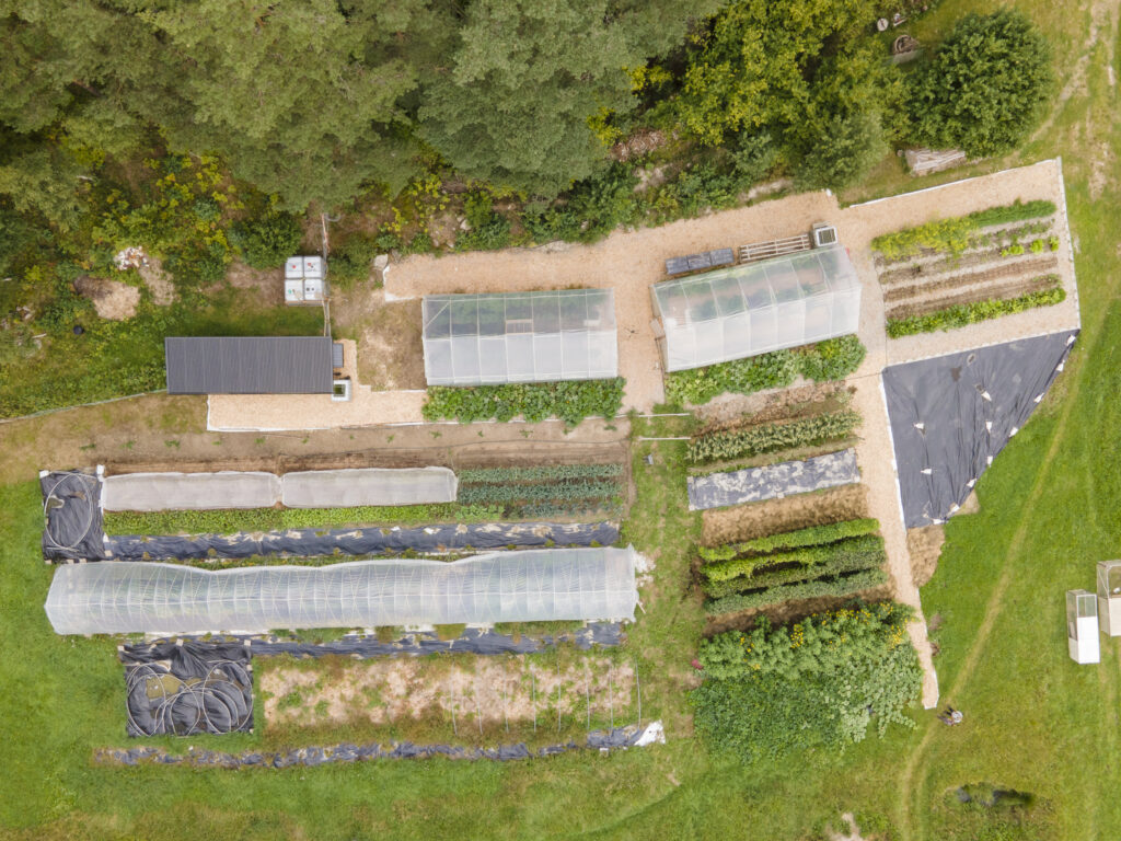 Här odlar vi intensivt för skörd – raka bäddar, tätt planterat och mycket arbete bakom varje rad. Det är här mycket av det som säljs i butiken börjar.