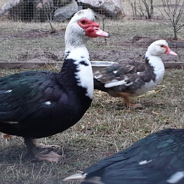 Lite spontant blev vi stolta ägare till en liten grupp myskankor tack vare en snäll granne. Vi har alltid tänkt skaffa ankor. Men tänkt att det skulle få bli ”sen”. När vi presenterades för Elvis och hans damer var det svårt att säga nej. De bor lite tillfälligt i en av våra ”flyttbara” utegårdar. Efter några veckor släpptes de ut med kalkonerna. Inga problem alls. Vi hade hoppats på att ha dem ute i fruktträdgården större delen av tiden men vips så var rovfåglarna som tog alla höns för oss i höstas här igen och cirkulerar… Tillsvidare får de nu bara vara ute när vi är ute i fruktträdgården eller i tunnelväxthuset.