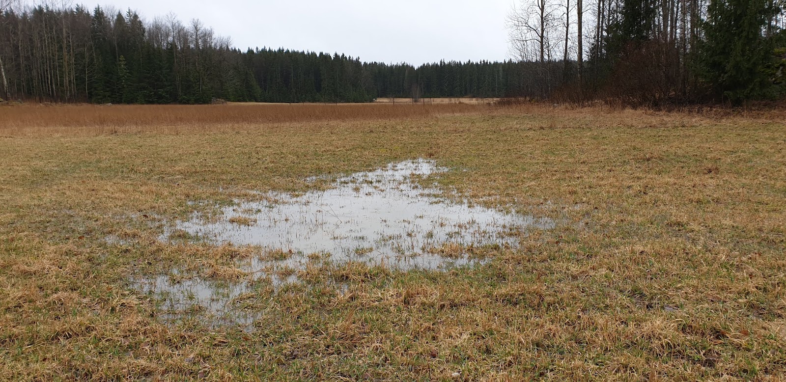 Det står vatten på ängen. Här kommer vi förhoppningsvis kunna gräva en stor damm som inte behöver en dammduk för att hålla kvar vattnet. Senare i år ska vi gräva några provgropar i detta område. |