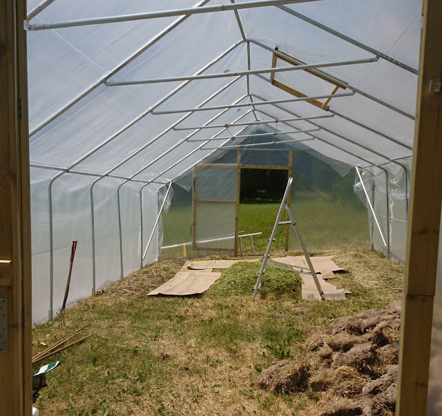 Idag ska lilla tunneln norr om huset tömmas om sen omorganiseras. Det mesta ska ner till Wonderland men några paprikor och tomater (Vilma och Tiny Tim) kommer att få stå kvar tror jag. Planen för hur allt ska se ut i tunnelväxthuset är fortfarande lite suddiga. Men grundstrukturen är att vi ska odla i halva tunneln nu under sommaren och andra halvan ska finnas tillgänglig för hönsen som hemskt gärna får sprätta sönder grässvålen. Någon gång i höst kommer odlingen och hönsen att byta sidor. Då får hönsen sprätta runt där jag odlat tomater, meloner med mera och så får jag vinterodla där hönsen (förhoppningsvis) förberett backen.