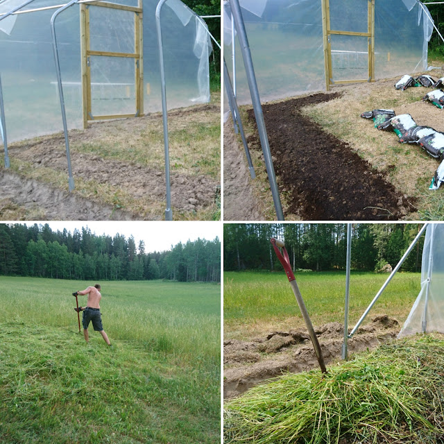 Åh jag vill bara ut nu och börja plantera. Lyckligtvis har jag redan tre bäddar förberedda. Min underbara mullvad Martin kom på den smarta idén att ställa i ordning bäddarna innan vi satte på plasten så att vi endast behövde gräva i +30 grader istället för +40 eller vad det nu kan tänkas bli i tunneln. Först så grävde han bort den snustorra grässvålen från cementen, jag menar, jorden. Sen vände vi ner mängder av ”naturgödsel” på påse. Det blev kanske 1-2 säckar (50 liter) per kvadratmeter. Därefter vattnade vi för att väcka de stackars i hoprullade maskarna och microlivet. Slutligen toppas allt med nyslaget gräs från vår äng precis utanför för att bevara fukten, förhindra uppkomst av ogräs och mata maskarna. Ner med lite plantor, vänta, vattna och om en liten stund skörda och njut!
