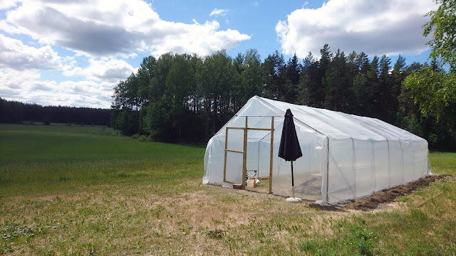 Idag ska lilla tunneln norr om huset tömmas om sen omorganiseras. Det mesta ska ner till Wonderland men några paprikor och tomater (Vilma och Tiny Tim) kommer att få stå kvar tror jag. Planen för hur allt ska se ut i tunnelväxthuset är fortfarande lite suddiga. Men grundstrukturen är att vi ska odla i halva tunneln nu under sommaren och andra halvan ska finnas tillgänglig för hönsen som hemskt gärna får sprätta sönder grässvålen. Någon gång i höst kommer odlingen och hönsen att byta sidor. Då får hönsen sprätta runt där jag odlat tomater, meloner med mera och så får jag vinterodla där hönsen (förhoppningsvis) förberett backen.